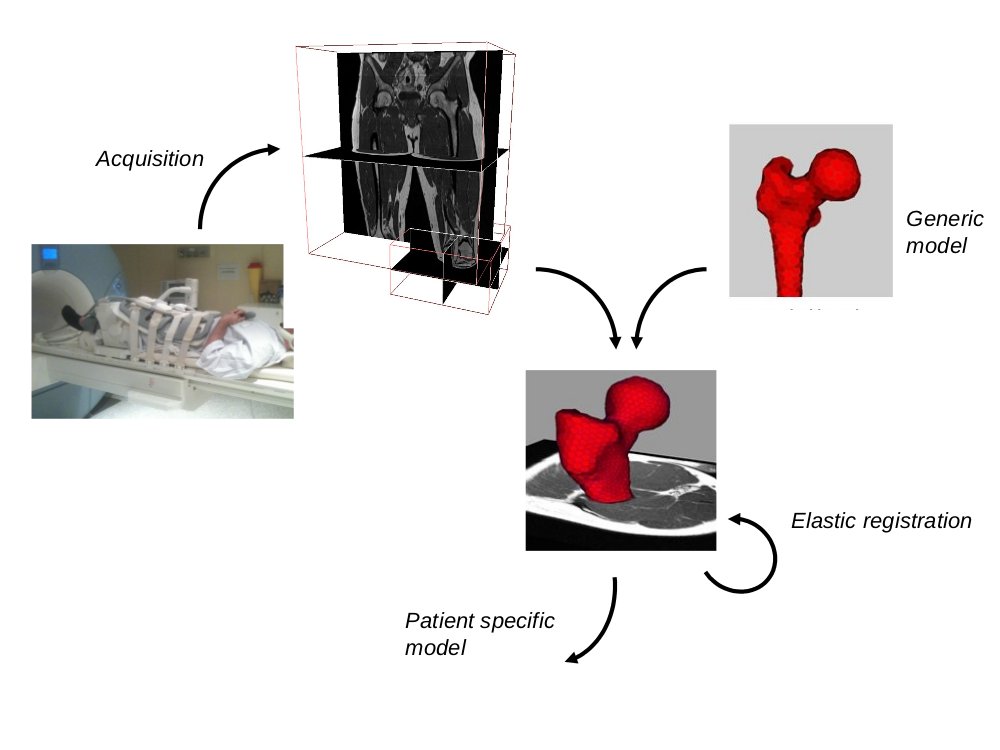 To build patient-specific models of the anatomy, I am interested in image registration techniques based on elastic deformable models. The approach is to iteratively align a generic 3d model with the structures of interest in the images. To improve robustness, models need to be constrained with a priori information about shapes and allowed kinematics. I am exploring algorithms to apply such constraints, mainly in the context of human musculoskeletal system 3d reconstruction, and MRI imaging.