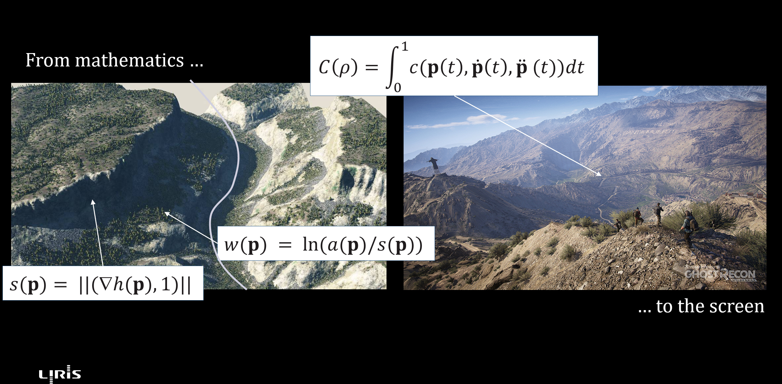 Dans cette présentation seront abordées quelques grandes classes de méthodes (simulation, génération à partir d’exemples et de données, génération procédurale) permettant de synthétiser des mondes virtuels. Le défi provient non seulement de l’extrême diversité des éléments naturels devant être modélisés (terrains, forêts, rochers, débris, chemins) mais également de la complexité de leurs formes caractéristiques, de leur distribution et de leurs interactions. A travers plusieurs cas, nous montrerons l’intérêt de travailler à l’interface entre plusieurs domaines, l’informatique graphique mais également la botanique, ou les sciences de la terre ou la géomorphologie, pour mettre au point des techniques, souvent hybrides, permettant de concilier le réalisme propre aux simulations avec l’exigence de contrôle nécessaire aux designers et la vitesse d’exécution pour l’enrichissement de scènes avec de nombreux détails en temps réel.