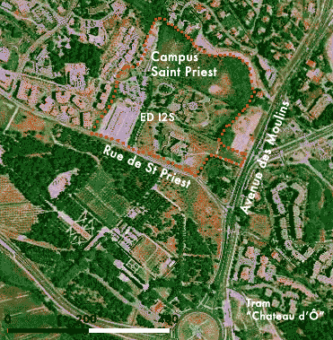 Prendre le tramway ligne 1 du centre ville (direction Mosson) et descendre à l'arrêt "Château d'Ô" situé sur l'avenue des Moulins (voir plan ci-dessous).